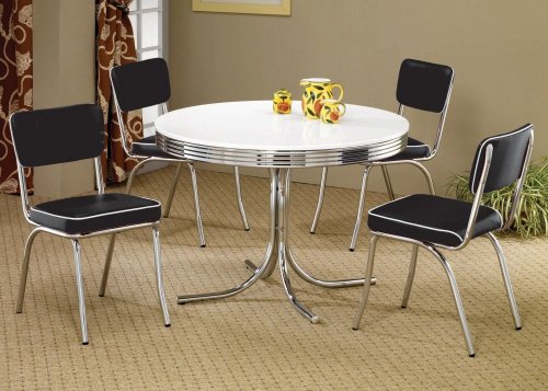 This furniture arrives mostly assembled. You will receive 4 chairs. Includes: 1 x Retro Round Dining Kitchen Table in Chrome / White 2 x Chrome Chair with Black Cushion (Set of 2) in Chrome / Black Features: Some assembly required Dimensions: Table: 42"(L) x 42"(W) x 31"(H) Chair: 21"(L) x 17"(W) x 35"(H) Finish: Table: Chrome / White Chair: Chrome / Black