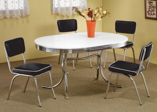 This furniture arrives mostly assembled. You will receive 4 chairs. Includes: 1 x Retro Oval Dining Kitchen Table in Chrome / White 2 x Chrome Chair with Black Cushion (Set of 2) in Chrome / Black Features: Some assembly required Dimensions: Table: 60"(L) x 36"(W) x 29 1/2"(H) Chair: 21"(L) x 17"(W) x 35"(H) Finish: Table: Chrome / White Chair: Chrome / Black