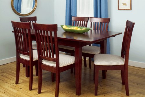 The Colby dining set mixes the classic mission style with the contemporary Euro cherry color of the solid wood. The Colby features a unique table which has a 14 inch self storing leaf. This leaf simply presses down and drops underneath the table where it is stored. The table measures 36x62 inches fully opened and without the leaf measures 36 x 48 inches. The set is made of plantation grown hardwoods - there are no veneers or presswoods.