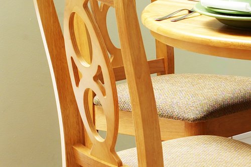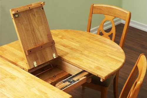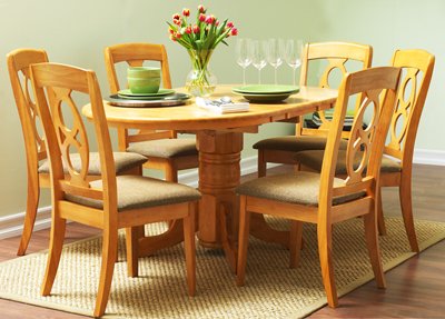 This 36 x 48 x 60 solid wood pedestal table features a 12 inch butterfly leaf. This high quality table contains a metal track which guides the adjustment of the self storing leaf. When the leaf is stored the table measures 36 x 48 inches. The sloping oval of the chair back is a complementary design to the oval shape of the table top. These chairs have a beautiful fabric cushion seat which looks great with the beech color wood finish. The table and six chairs ship in 5 boxes. This set is shipped via appointment delivery with a freight carrier that specializes in furniture delivery. You will be contacted within 4-7 business days after the set ships to make a home delivery appointment (Mon-Fri 9am-5pm) Assembly is required - hardware and instructions included. In stock now.